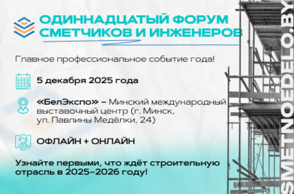 5 декабря 2025 года («БелЭкспо», г. Минск, ул. Павлины Медёлки, 24) состоится Одиннадцатый форум сметчиков и инженеров – ключевое событие для специалистов строительной отрасли.